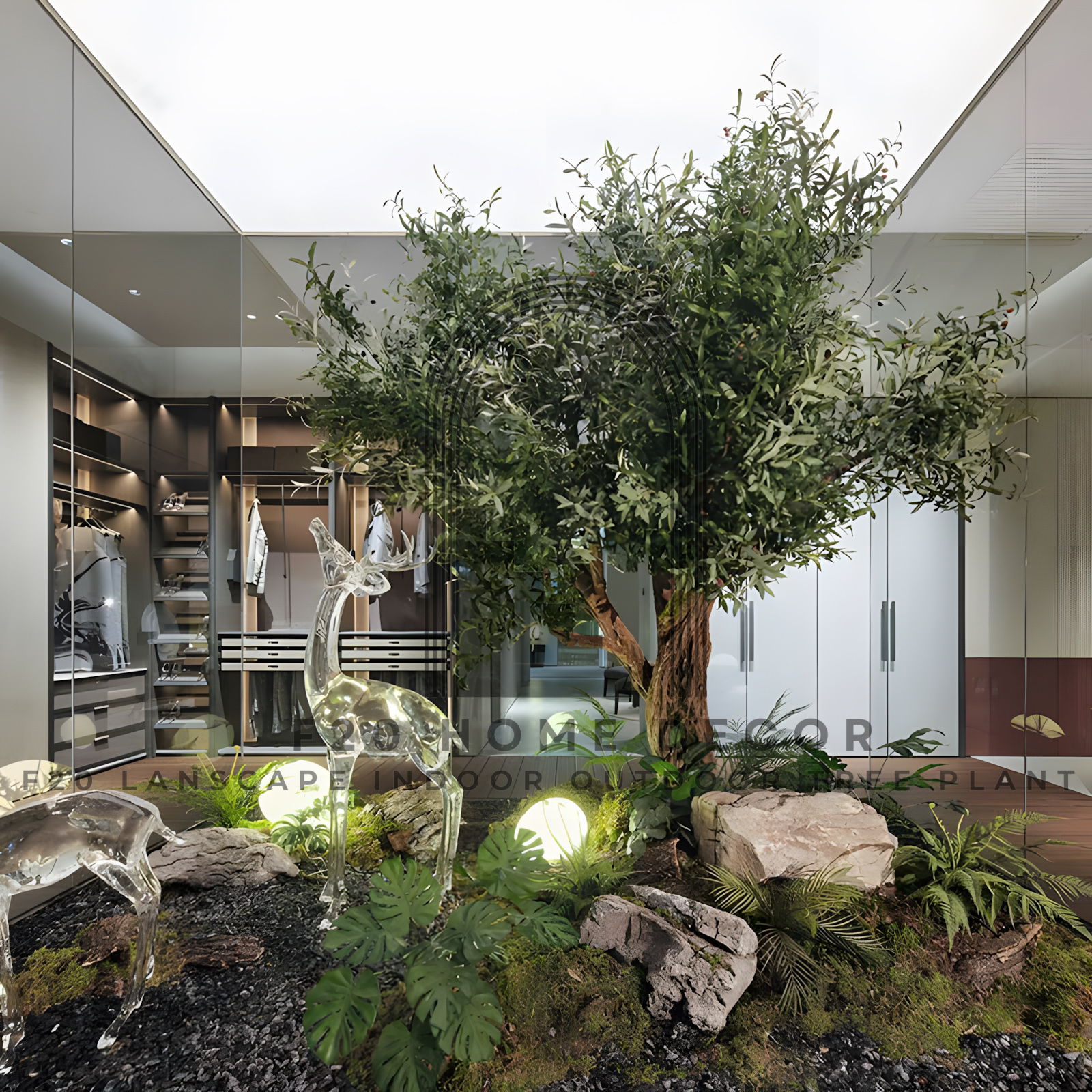 Cây ô liu, tên khoa học Olea europaea, tượng trưng cho sự hòa bình, thịnh vượng và trường thọ. Trong phong thủy, cây ô liu được cho là mang lại may mắn, tài lộc và năng lượng tích cực cho gia chủ. Cây ô liu giả trong hình có tán lá rộng, xum xuê, thân cây thẳng đứng, vững chãi, tạo nên vẻ đẹp khỏe khoắn, sang trọng. Cây được bài trí hài hòa cùng các vật dụng trang trí khác như tượng hươu trong suốt và đèn đá, tạo nên một không gian sống đẳng cấp và gần gũi với thiên nhiên.