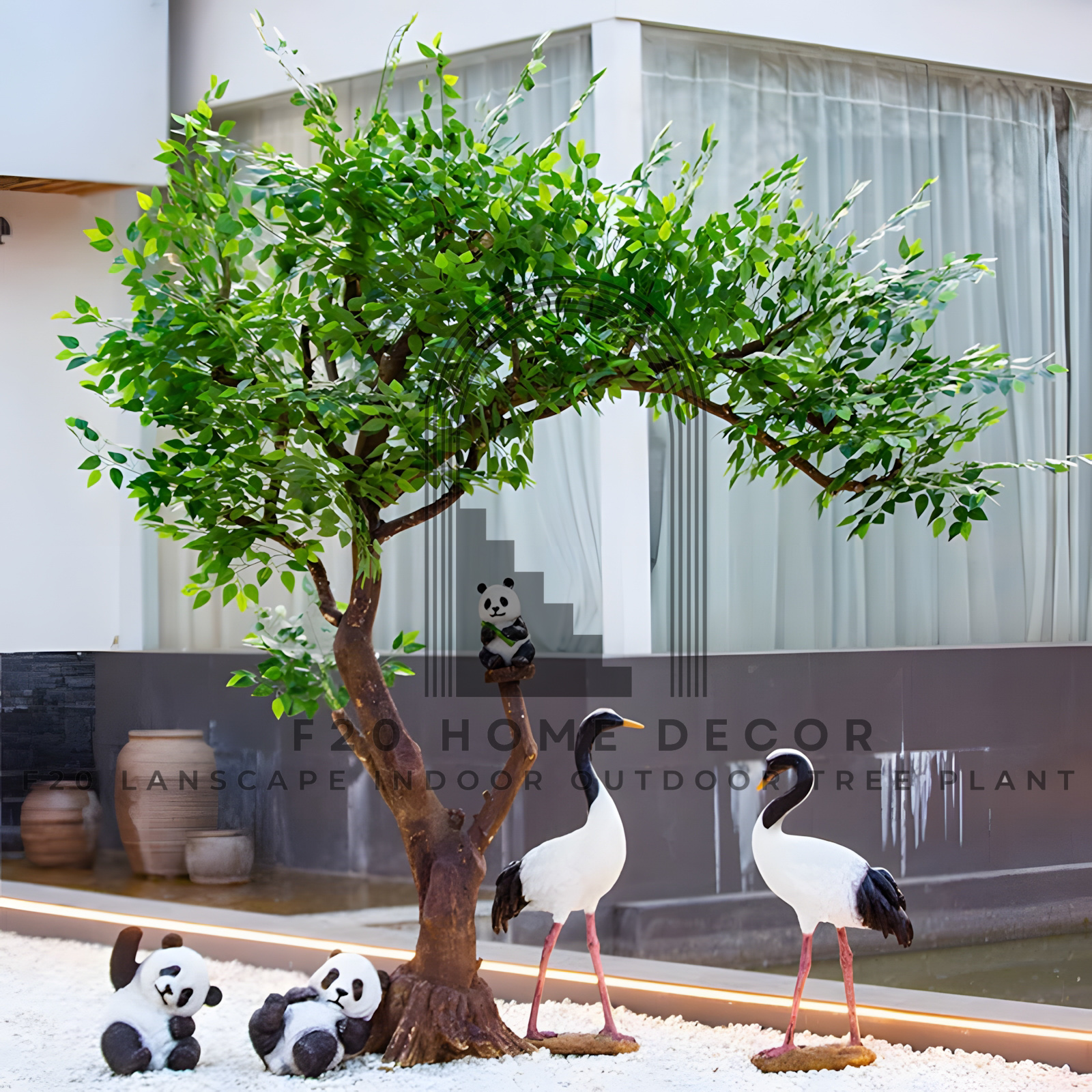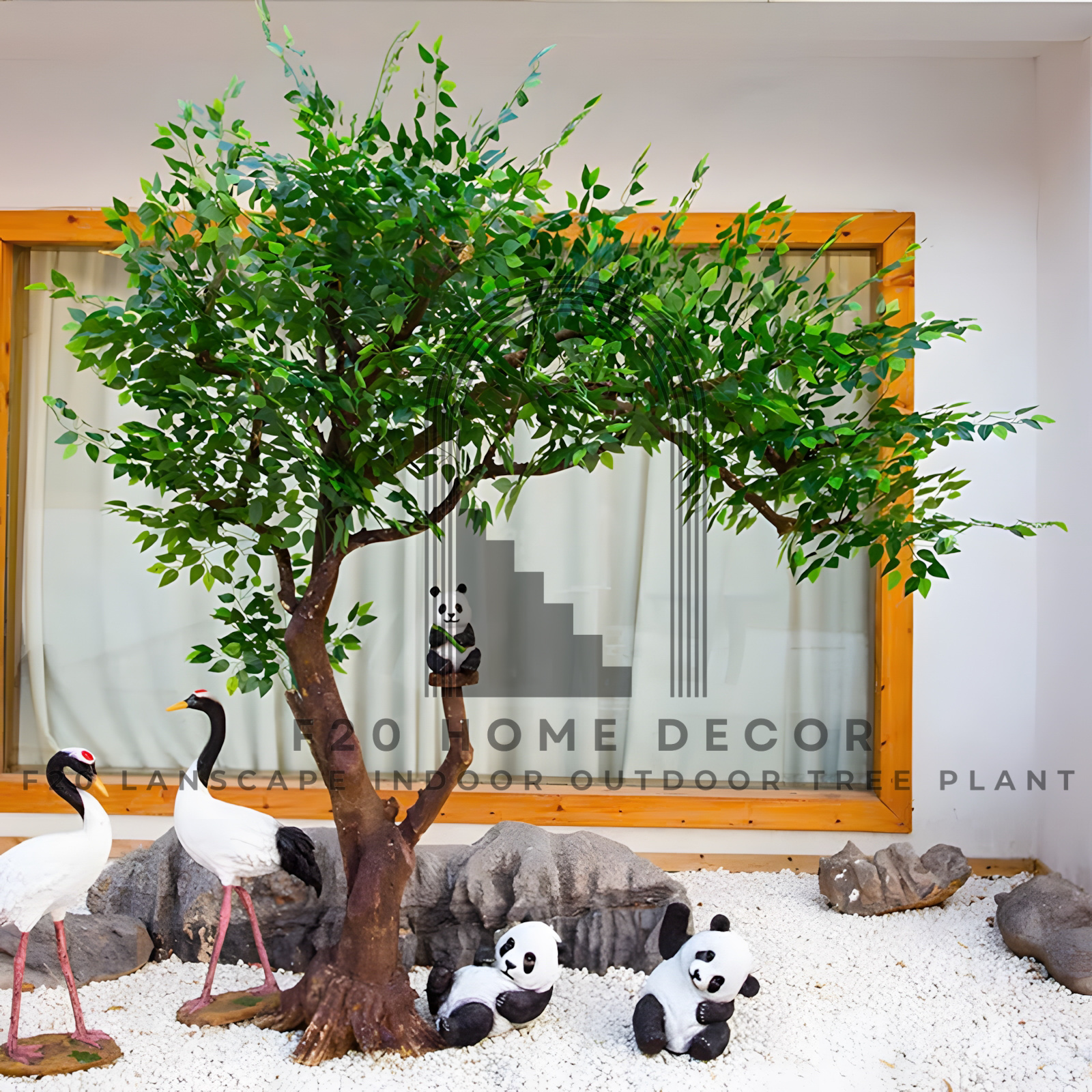 Cây si, tên khoa học là Ficus benjamina, là biểu tượng của sự trường tồn, sức sống mãnh liệt và may mắn. Trong phong thủy, cây si được cho là có khả năng xua đuổi tà khí, mang lại bình an và tài lộc. Cây si giả trong hình được đặt trong tiểu cảnh trang trí với sỏi trắng, đá và tượng hạc, gấu trúc, tạo nên một không gian hài hòa, gần gũi với thiên nhiên. Thân cây chắc chắn, tán lá xum xuê mang đến cảm giác thư thái, yên bình.