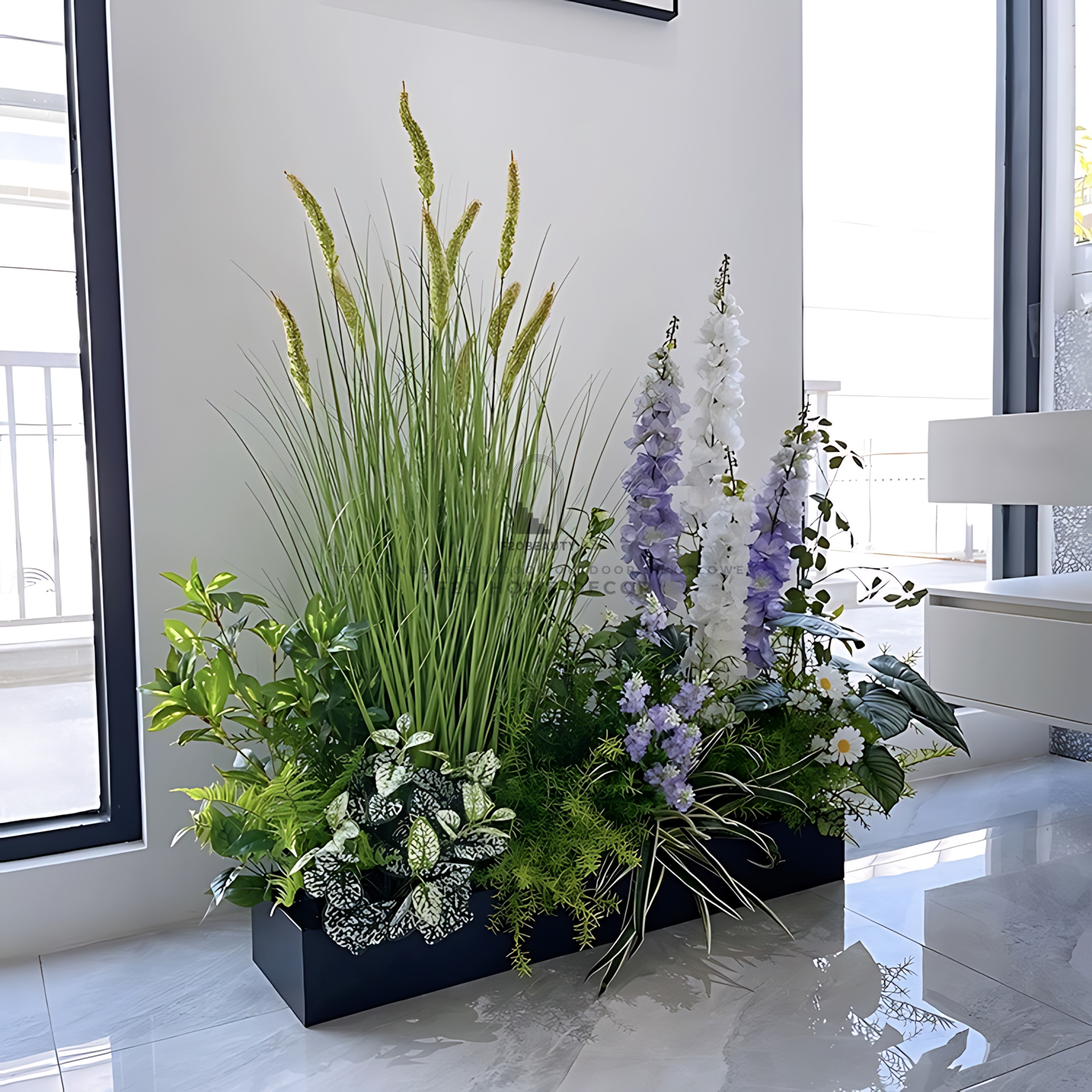 Hộp hoa cỏ lau kết hợp hoa trang trí cầu thang văn phòng