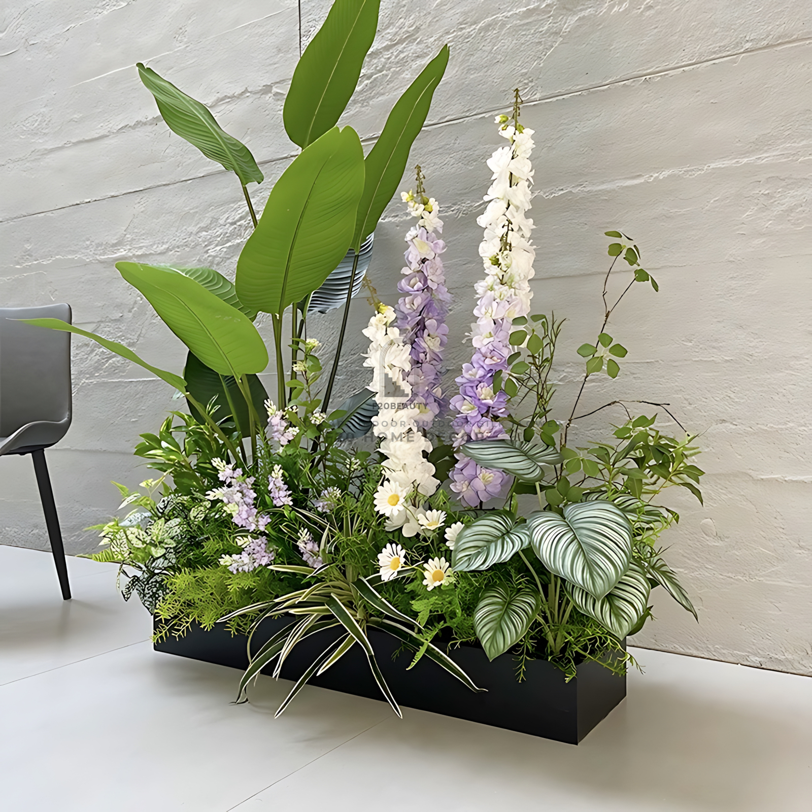 Hộp cây chuối kết với hoa giả trang trí cầu thang văn phòng
