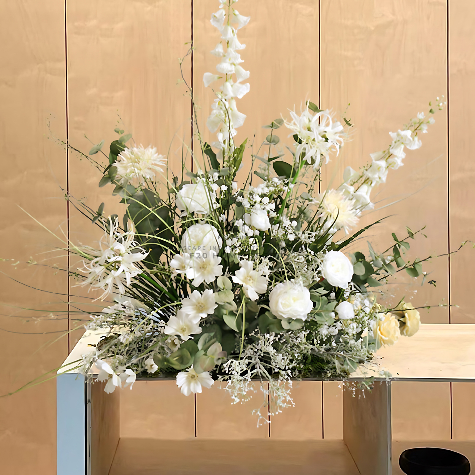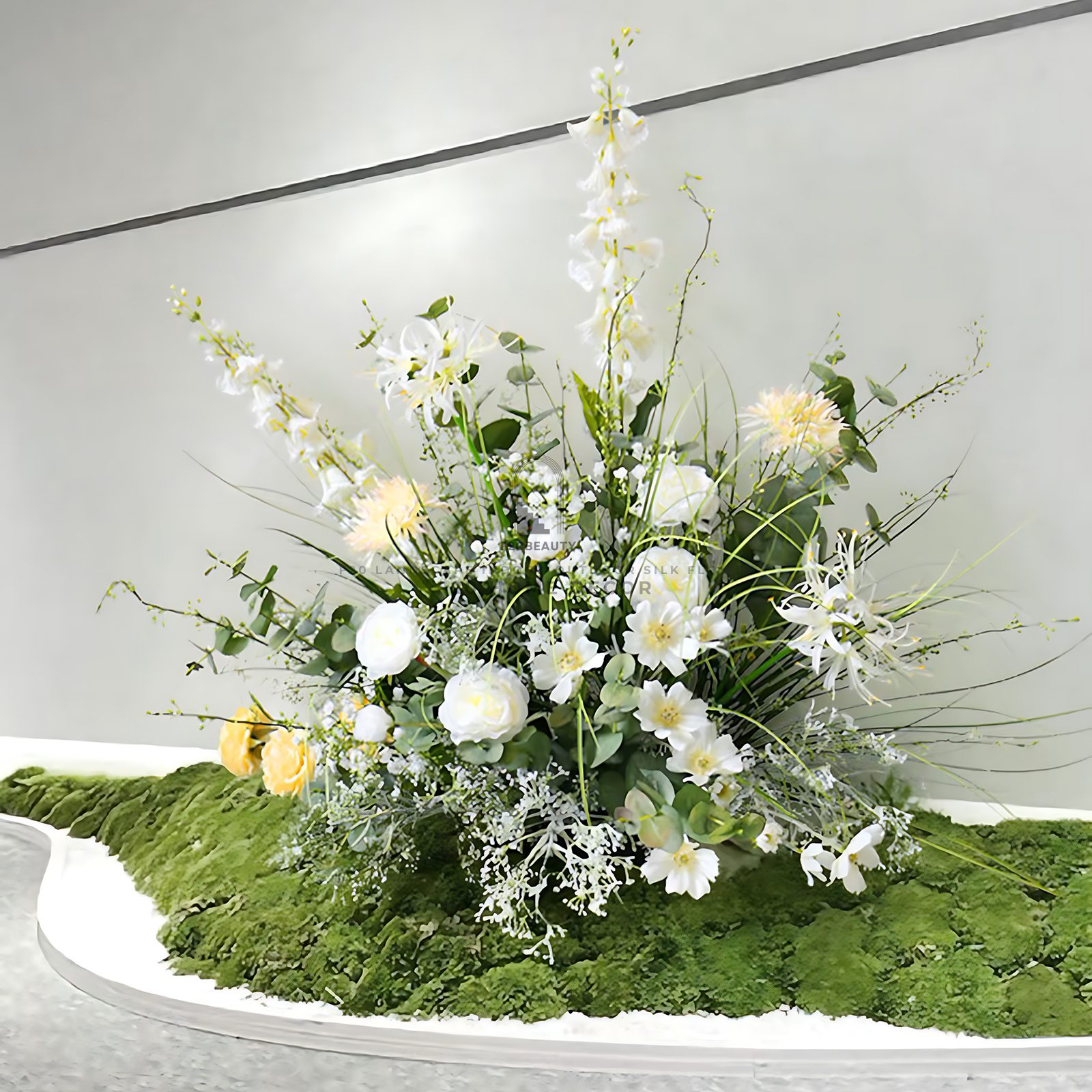 Thi công tiểu cảnh hoa giả trang trí quán cafe tông màu trắng